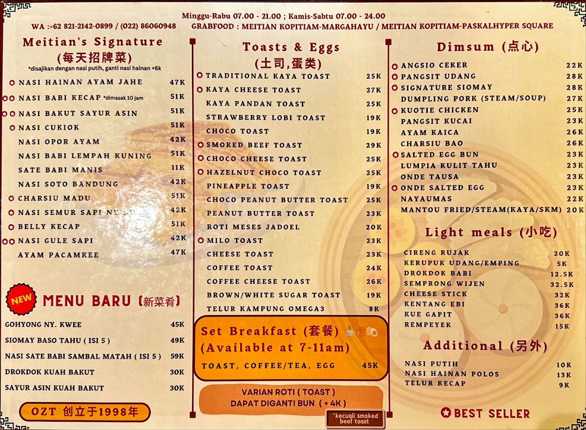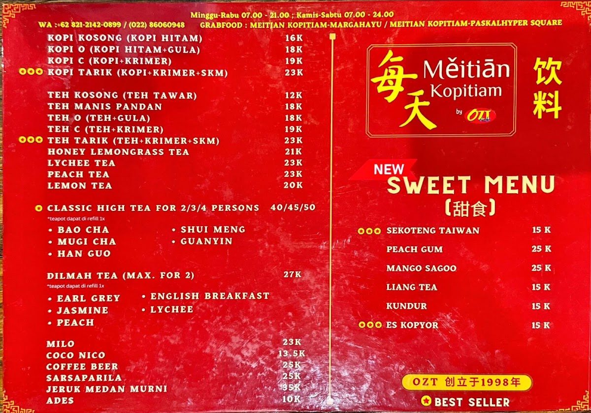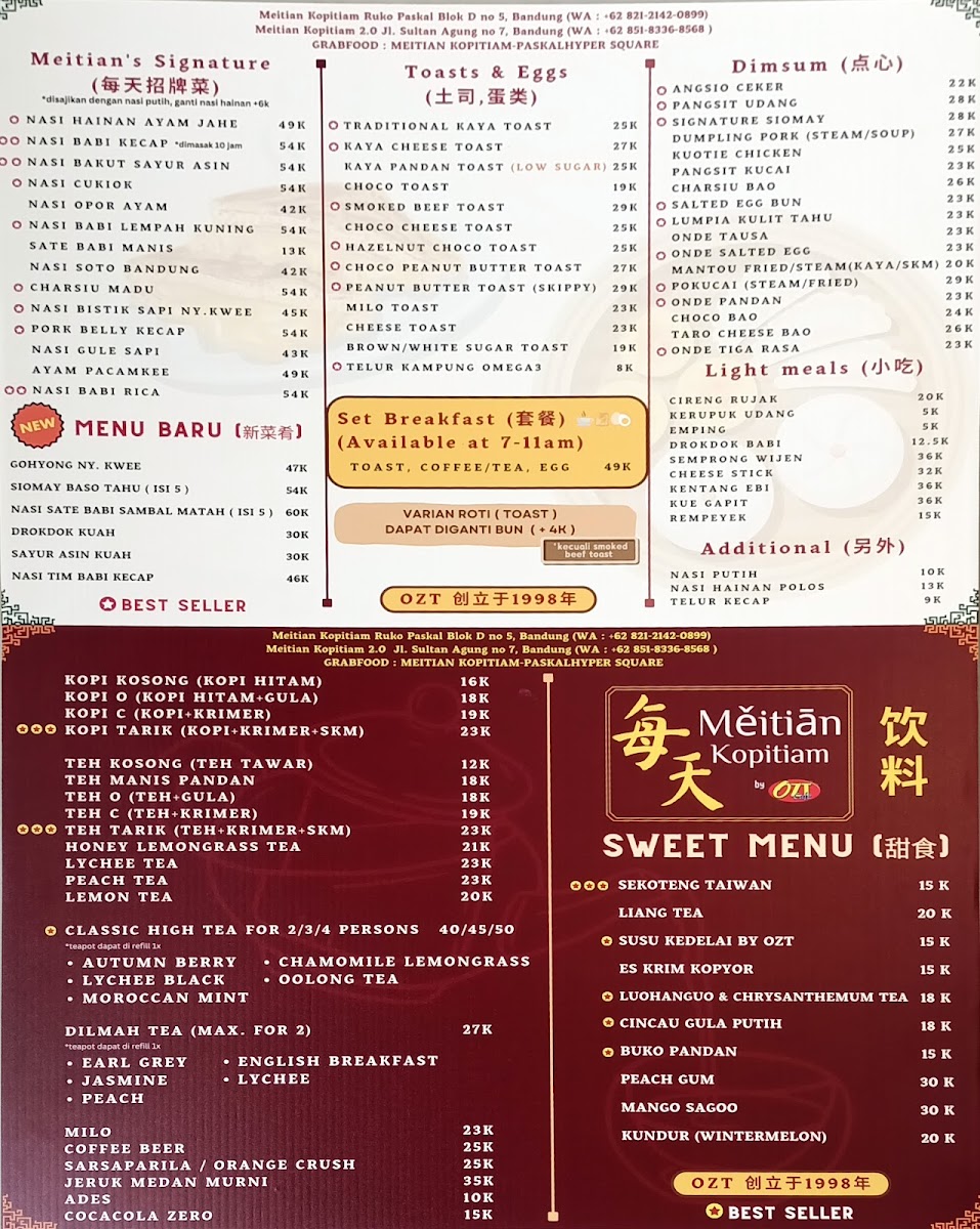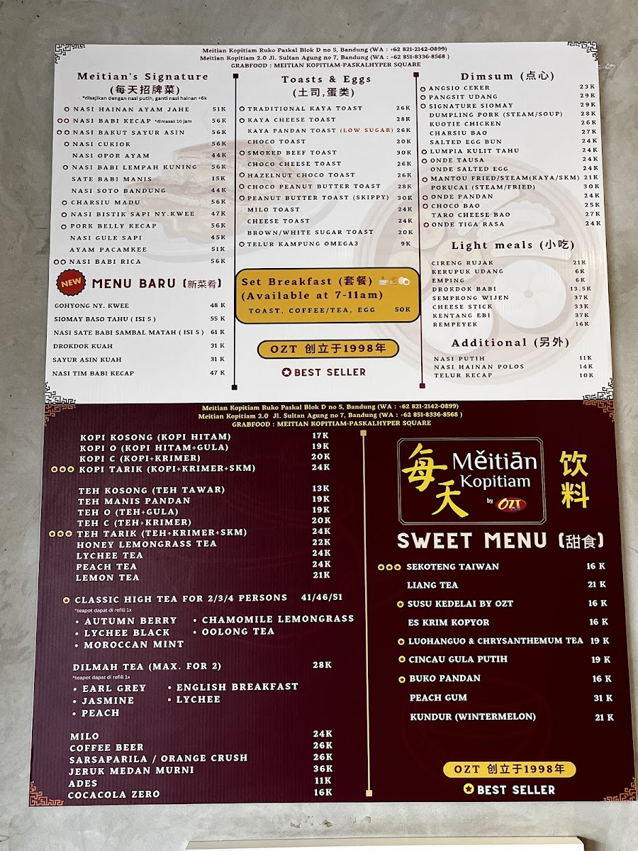 Měitiān Kopitiam presents a delightful menu that masterfully blends authentic Chinese flavors with comforting home-cooked essence. Located in Kota Bandung, this coffee shop is a haven for those seeking rich, soulful dishes. Highlights include the tender, juicy pork ribs, praised for their perfect balance of softness and taste. Signature dishes like Nasi Cukiok, Nasi Bakut Sayur Asin, and Gohyong each deliver whispers of tradition with every bite, comforting yet vibrant. The Asian sauerkraut and pork rib soup stand out with their mild savoriness and homely aftertaste, making each spoonful memorable.